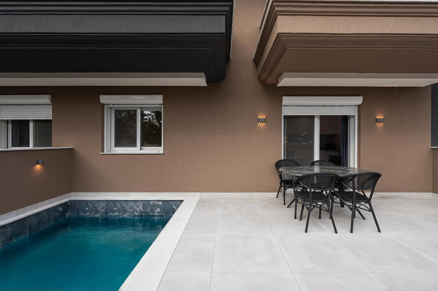 Σουίτα με Ιδιωτική Πισίνα. This suites standout feature is the private pool. Boasting a private entrance, this air-conditioned suite includes 1 living room, 1 separate bedroom and 1 bathroom with a shower and a hairdryer. In the well-equipped kitchen, guests will find a stovetop, a refrigerator, kitchenware and a microwave. Featuring a terrace with pool views, this suite also offers a washing machine and a flat-screen TV with satellite channels. The unit has 2 beds. ;